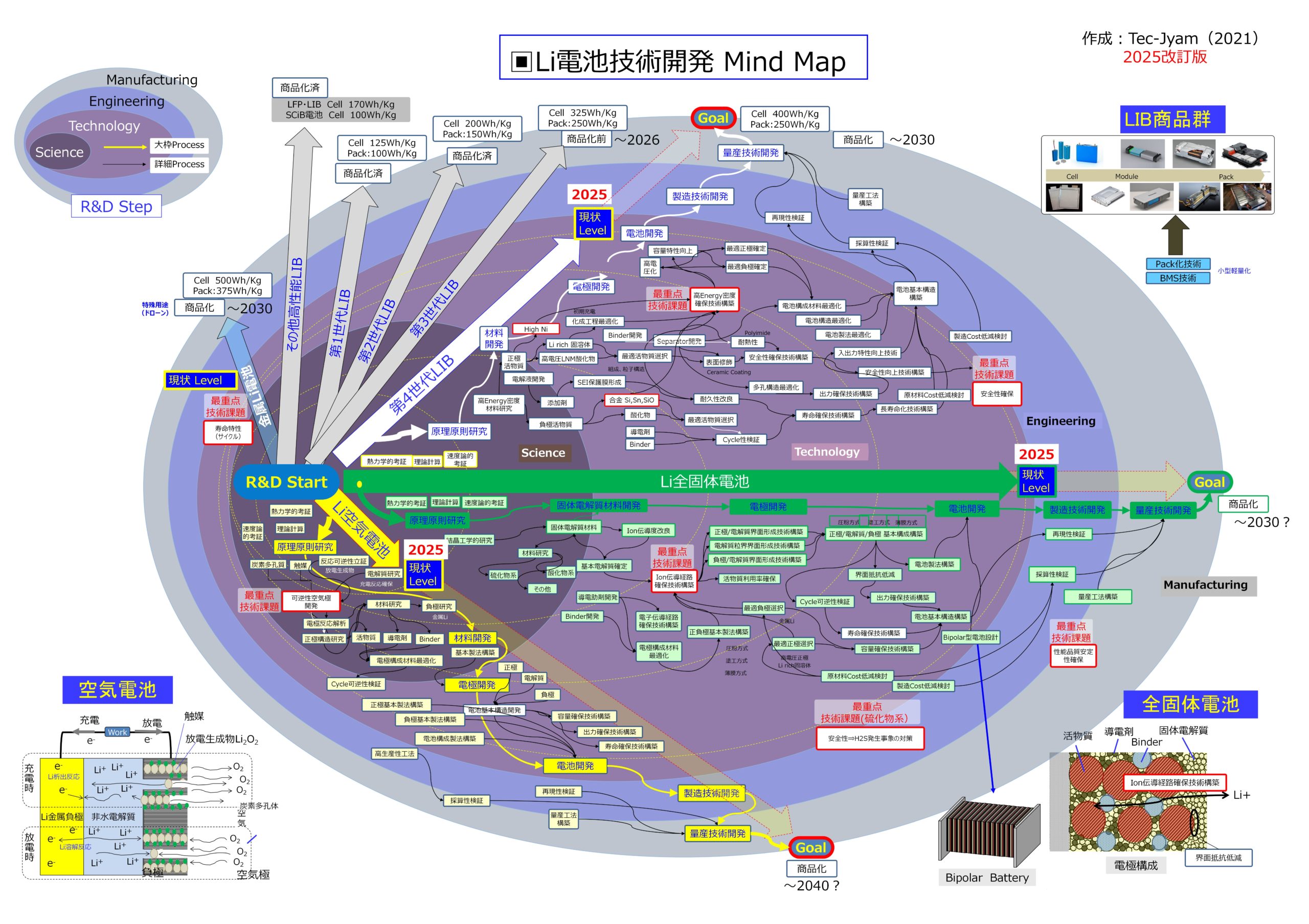 ●LIBは世代更新・交代が盛ん ●全固体電池(完全無機固体電解質電池)はEngineering領域克服に苦戦 ●空気電池はScience領域からも出られず ●固体電池(高分子等有機系電解質含有等)は開発進展中 ●BMS進化・モジュールレス等でパックのエネルギ密度の向上が図られている